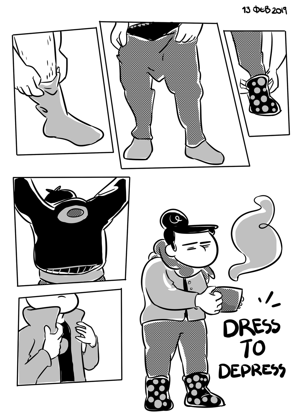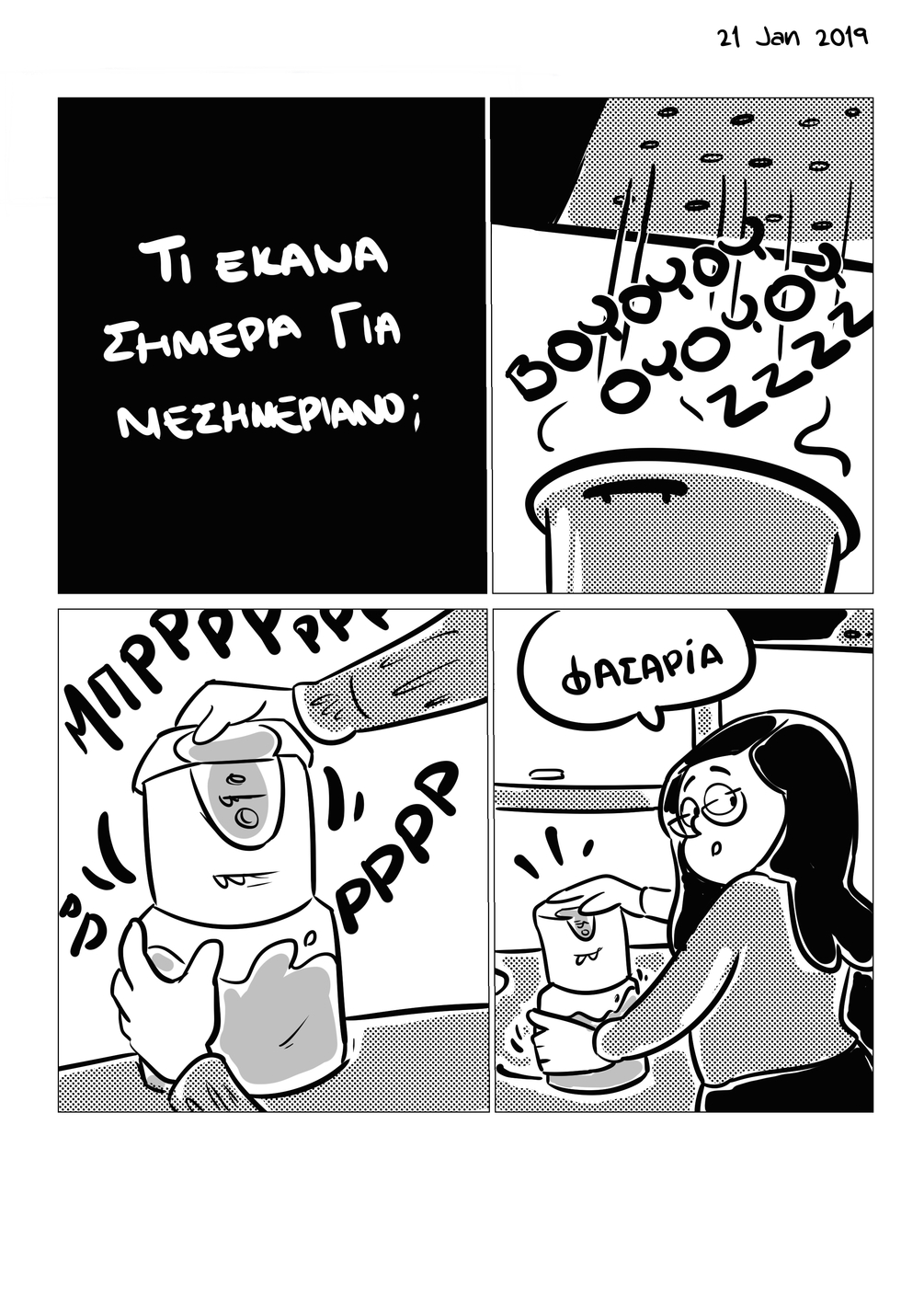 Ένα περίπου καθημερινό κομιξοημερολόγιο από αυτοτελή βιογραφικά κόμικ που δημιουργήθηκαν από το Νοέμβρη του 2018 έως τον Μάρτιο του 2019. Πρωτοδημοσιεύτηκαν ως προσχέδια στο Patreon μου ως εβδομαδιαία ανταμοιβή για τα άτομα που με υποστήριζαν. Περιέχει και μία έξτρα κομιξοέκθεση σε σχέση με κάτι χάπια.